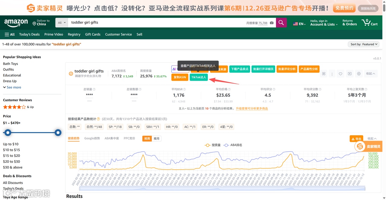 2.与卖家精灵深度协同:如果你是卖家精灵的用户,在亚马逊页面(如 Listing、关键词、品牌处)直接点击“TikTok达人”,即可直接查看产品的TikTok相关达人。