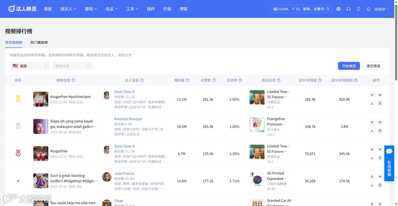 达人精灵是卖家精灵官方生态旗下,专为跨境电商卖家打造的TikTok数据分析与选品工具。