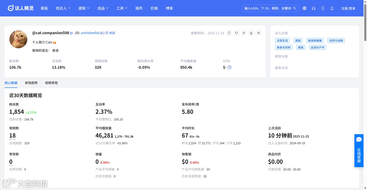 1.达人数据深度分析:在达人精灵网页端找到达人后,查看达人详情,获取达人账号基础数据、近期关键数据及表现趋势、带货视频表现等全方位数据,对其数据真实性、带货偏好、带货转化能力等进行深度背调,科学评估达人带货能力。
