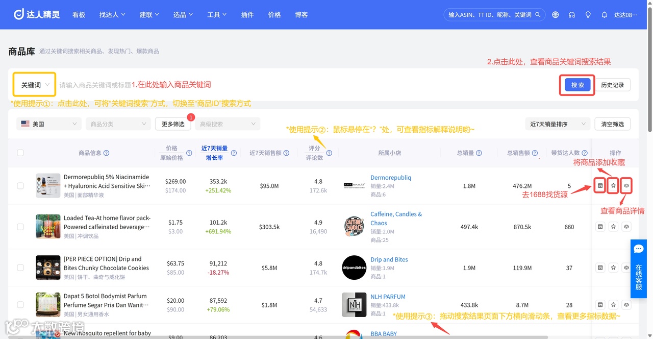 图:达人精灵网页端「商品库-关键词搜索」商品搜索功能截图