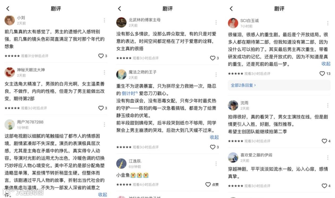 尤为难得的是其营造的短剧稀缺特质——“离场感”:当陈钧因攻克医学难题透支生命早逝,道出上一世遗憾并再度踏入似梦非梦的“重生”时,剧情虽已落幕,观众情绪却迟迟未散场。大家反复回味细节、发帖讨论,甚至联想到自身青春遗憾并付诸行动,让震撼与触动徐徐沉淀。