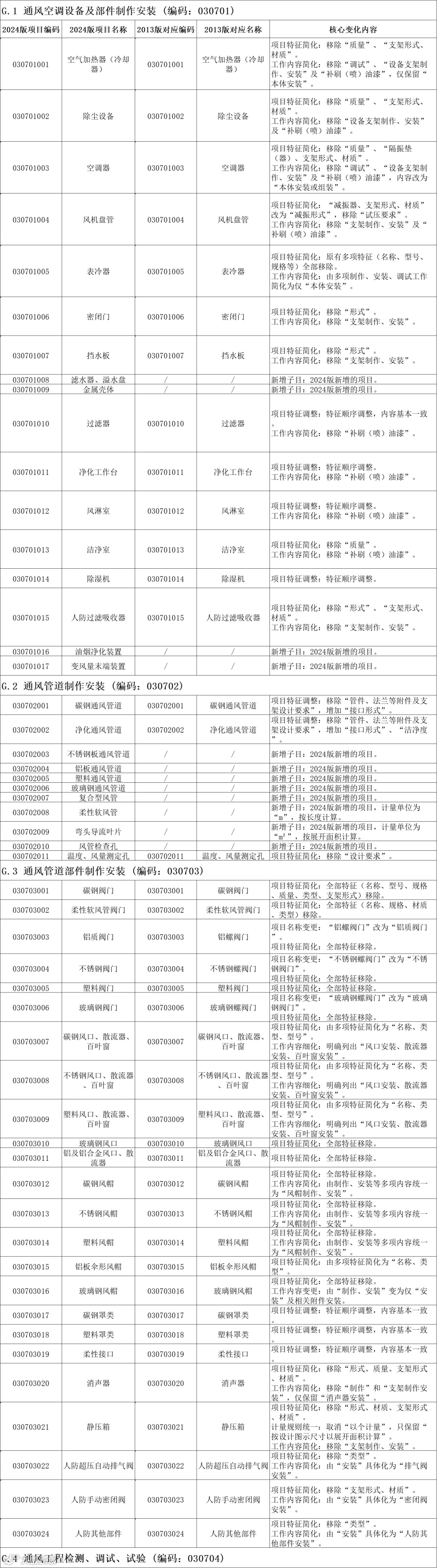 2024 版附录 G 相较于 2013 版,既是对通风空调行业技术发展的响应,也是对工程计价与管理需求的深度适配。从新增油烟净化装置、变风量末端装置等子目以覆盖新技术应用,到简化项目特征中冗余的支架、油漆等辅助描述以聚焦核心参数,再到整合检测调试内容、明确关联工程列项规则以提升规范实用性。