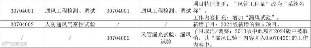 检测调试升级:将“通风工程检测、调试”的工作内容扩充,纳入了“漏风试验”,并将“风管漏光试验、漏风试验”子目取消,其功能被整合。同时,新增了“人防通风气密性试验”作为独立子目。这强化了工程验收的检测要求,突出了系统性能调试的重要性,特别是对人防工程的特殊要求给予了更明确的计价依据。