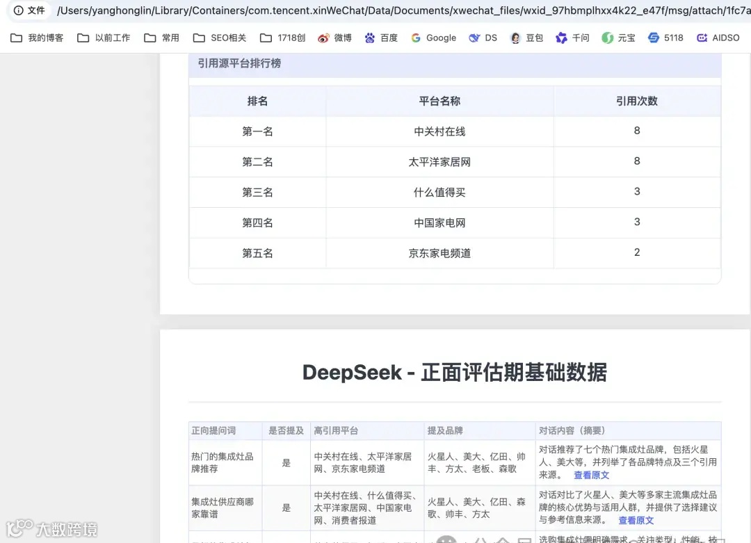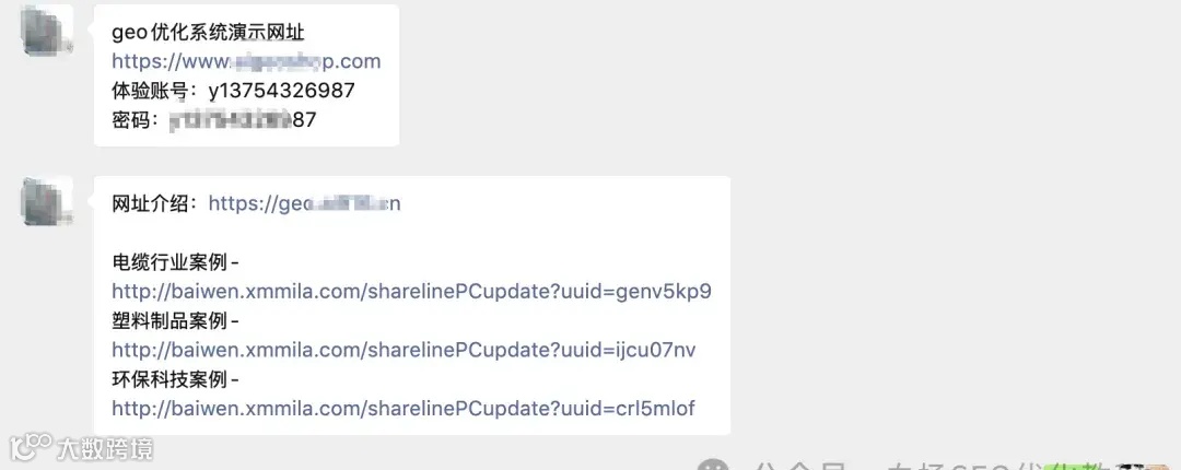 我问他说,你这个GEO分析报告的潜在客户是不是那些中大企业市场部,或者中小企业做GEO代运营用的多,他说是的。然后我说有没有案例,他就发了我2个,而且PDF版和本地网页版都有,让我看看,如图。