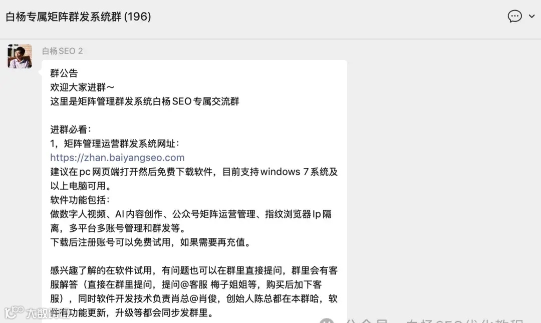 如果你注册和下载了试用软件,有问题的话网站上有我联系方式,或者也可以直接加我的微,baiyang2047,验证【全网软件】,我会邀请你进这个软件交流群,如图。注,不接受任何非法业务使用,否则后果自负。