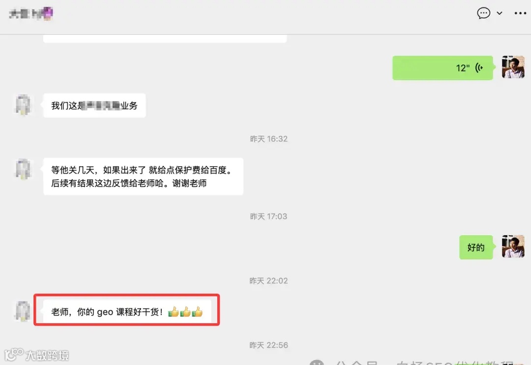 因为白杨SEO这边只做研究和顾问或教学,不代做,所以会有做的朋友找到我。至于需要与否,你自己判断,该走合同也是要走合同的。至于关于白杨SEO的GEO课程怎么样,给大家看一个买过的昨晚我在直播时一个买过的朋友发我的,如图: