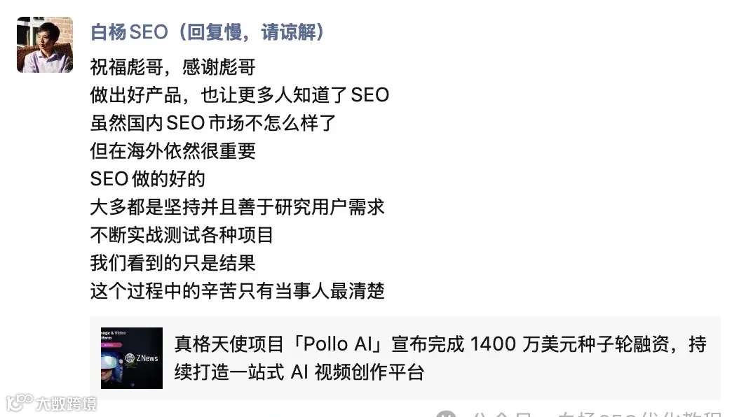 很多做AI出海的朋友,在搞流量上特别头疼。HIX AI & Pollo AI的创始人@阿彪,他的AI视频生成产品 Pollo AI 在前不久完成了1400万美元的融资。