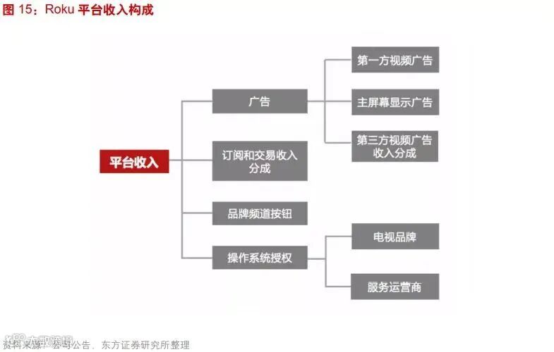 财报说数据显示,自2018年后,Roku的毛利率一直维持在40%之上,这一整体毛利率的提升源于平台业务的拉动。东方证券的报告显示,Roku的平台收入构成主要包括四个方面,广告、订阅和交易收入分成、品牌频道按钮以及操作系统授权。