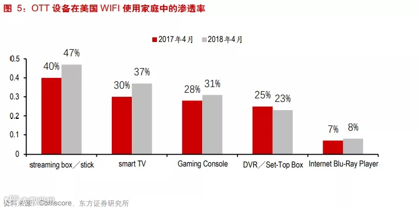 ComScore的报告显示,截至2018年4月,美国使用流媒体机顶盒或电视棒的家庭用户的数量达到了3360万,流媒体机顶盒设备/电视棒在美国的渗透率达到了47%,同比增长了7%,使用流媒体机顶盒/电视棒这些终端设备的用户平均每月电视观看时间为53小时。简而言之,电视的时代似乎又重新来临了。
