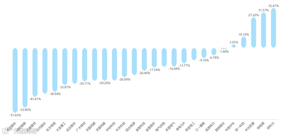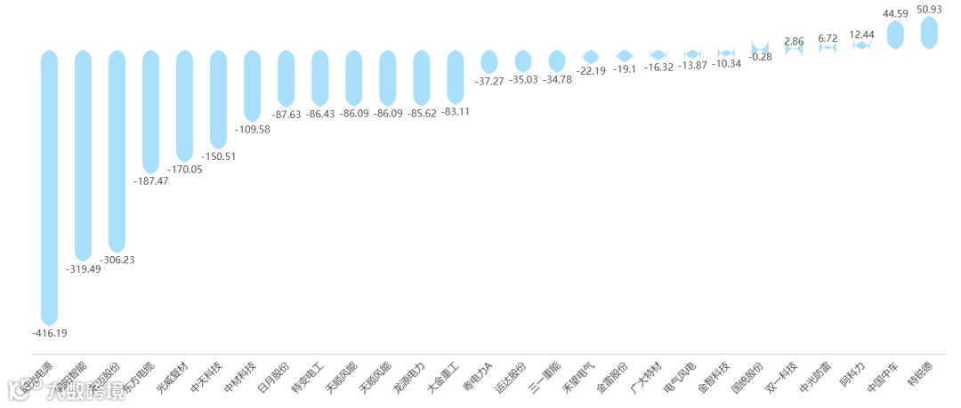 据不完全统计,2023年度(2023年1月3日至12月29日)所选部分风电产业链A股上市公司中,超八成公司市值呈下跌状态。其中,阳光电源、明阳智能、禾迈股份等公司市值蒸发超300亿元。禾迈股份、明阳智能两家企业市值跌幅超50%,惨遭腰斩。