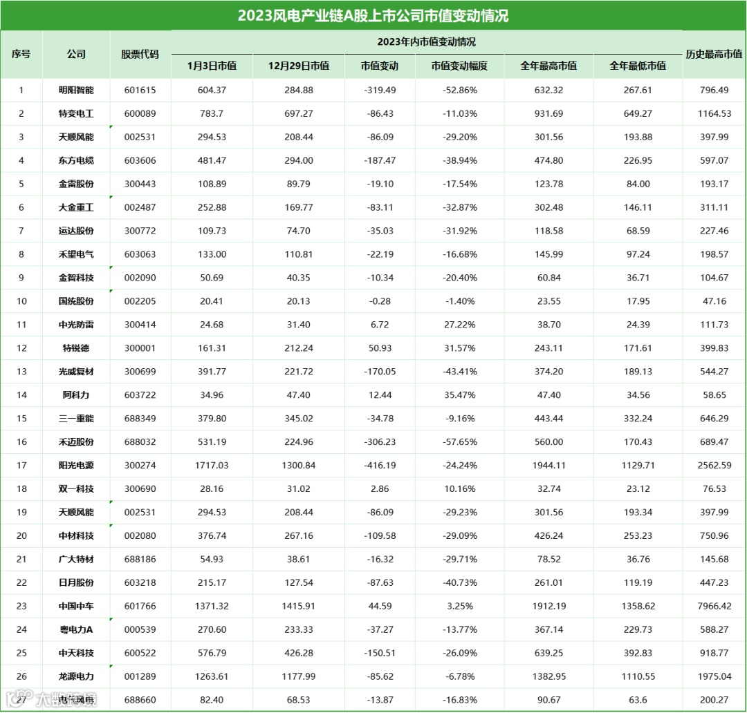 2023年以来,由于产业链上游钢材、玻璃纤维等原材料价格下跌,零部件厂商盈利空间上升,国内风电市场有所回暖。但即便如此,也没有挽救风电企业市值大跌的现状。
