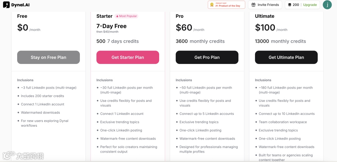 目前 Dynal 的免费档是 0 美元/月,大概能支持 3 篇多图形态的 LinkedIn 帖子,送 200 个 starter credits,可以连 1 个账号,导出的内容会带水印,适合用来摸一摸流程。