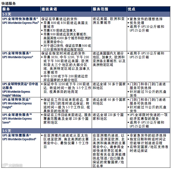 - UPS Worldwide Saver:1-3个工作日送达,俗称“红单”,全球速快服务。
