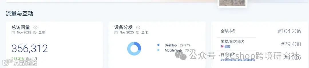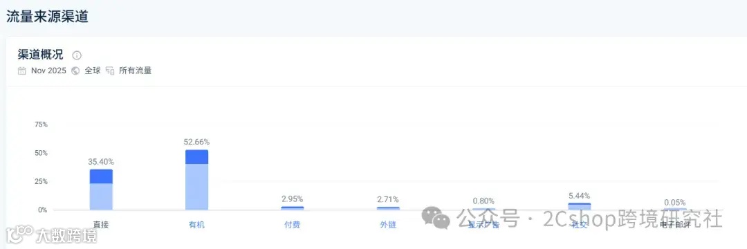 Similarweb数据显示,其独立站月访问量超35万次,其中直接流量与自然搜索占比高达86%以上,构成了健康、可持续的流量基本盘。