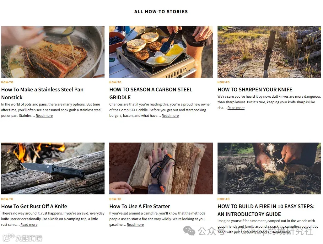 Gerber十分重视博客内容的更新,将博客文章分为户外冒险故事系列、装备系列、操作指南、食谱等四大类,并嵌入产品链接与真实用户反馈,既提升搜索引擎收录率,又以场景化内容促进转化。