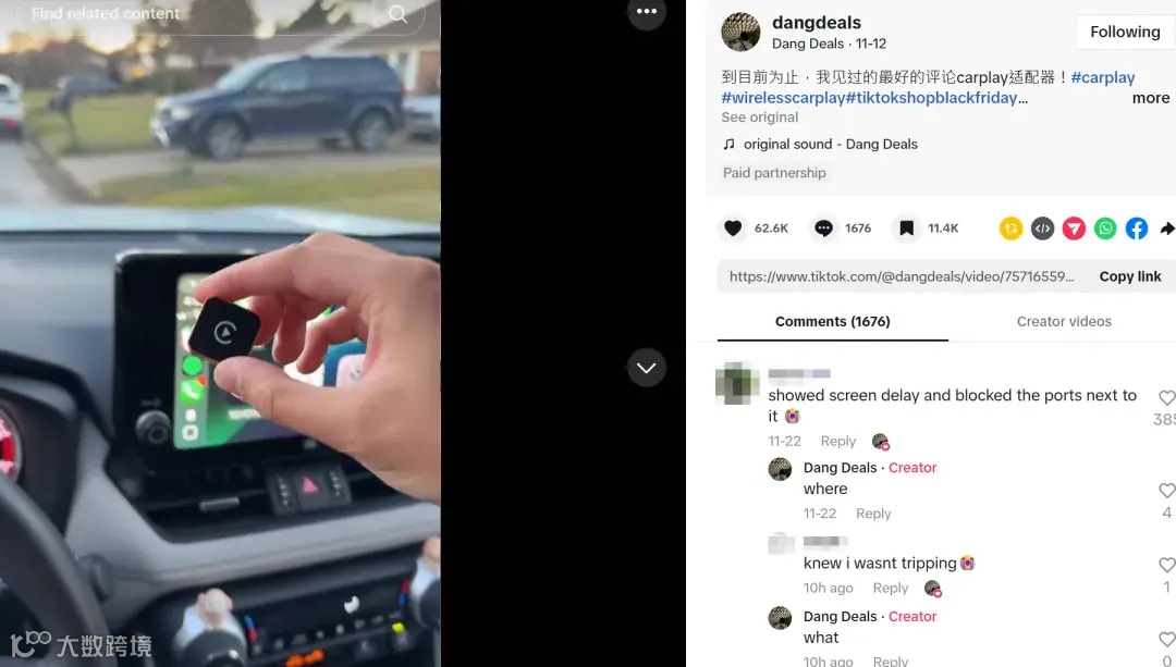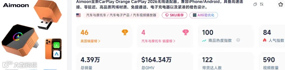 2025 年 11 月,深圳卖家一款兼容安卓与苹果手机的 CarPlay 无线盒子登陆 TikTok 美国区,凭借即插即用、连接稳定、延迟低的核心优势,30天狂售4万多单,营收超160万美元(约合 1130 万元人民币)。