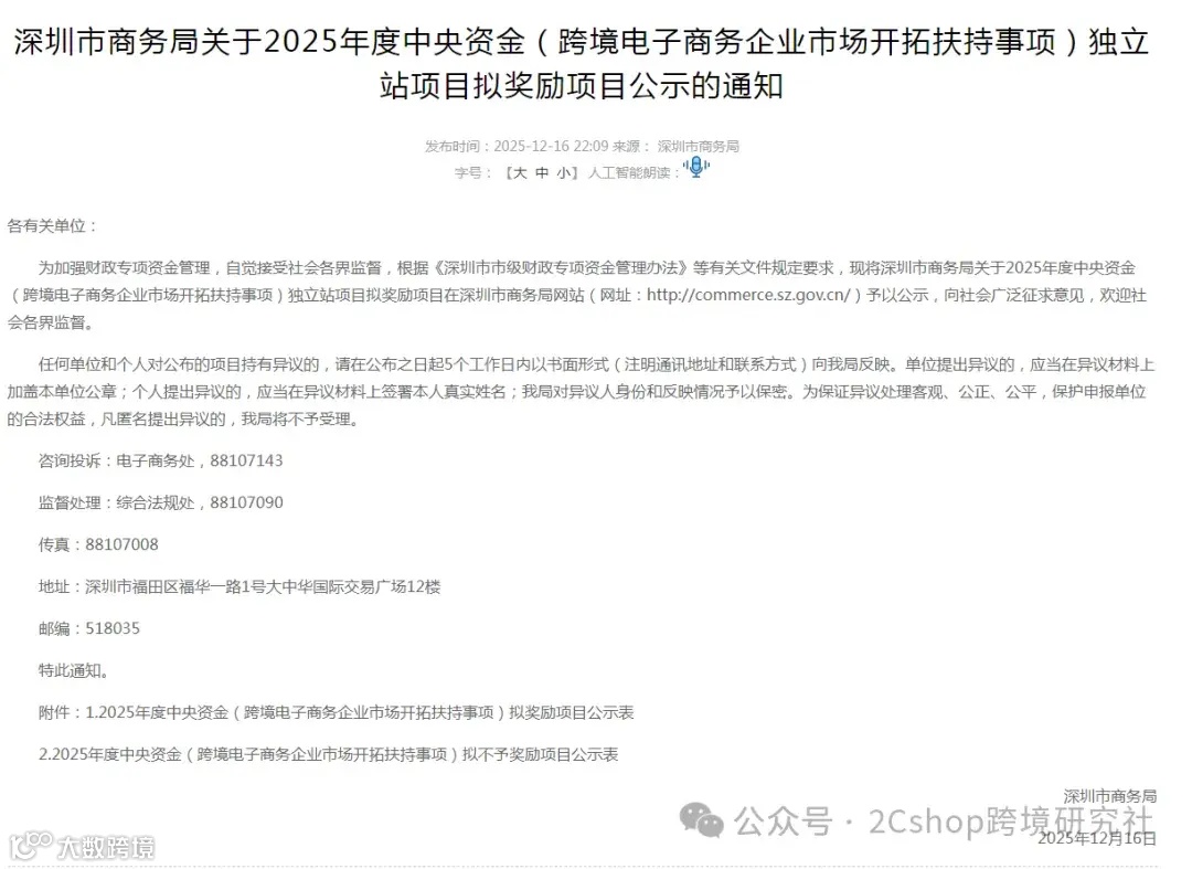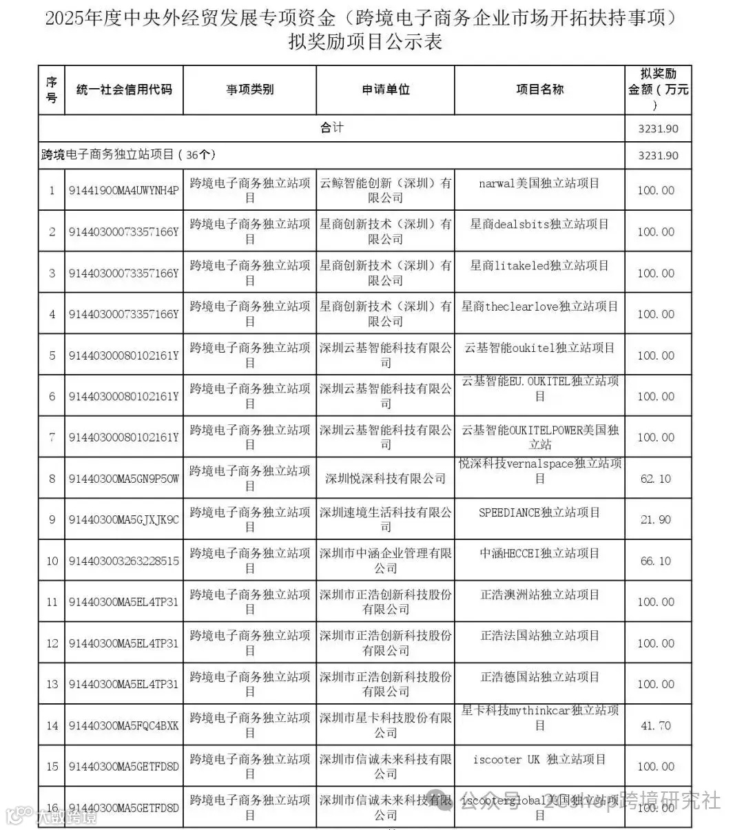12月16日,深圳市商务局发布了“关于2025年度中央资金(跨境电子商务企业市场开拓扶持事项)独立站项目拟奖励项目公示的通知”,公布了一批获得专项奖励的跨境电商企业。