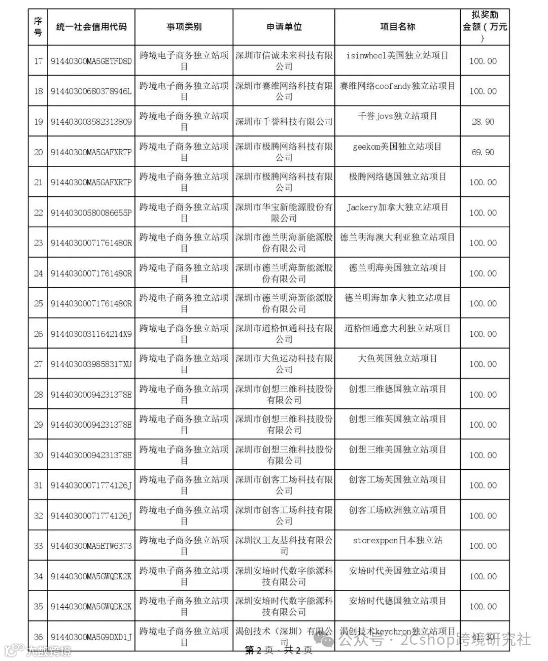 具体来看,这次共有36个独立站项目获得奖励,金额从21.9万到100万元不等,总计3231.9万元。