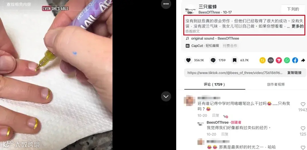 US-HollyGifts店铺合作的一位TikTok博主,通过分享了她用金色马克笔给女儿做美甲的一个视频——视频里笔尖一划鲜艳的颜色就显出来了种草视频仅在30天就收获了1250万次播放。