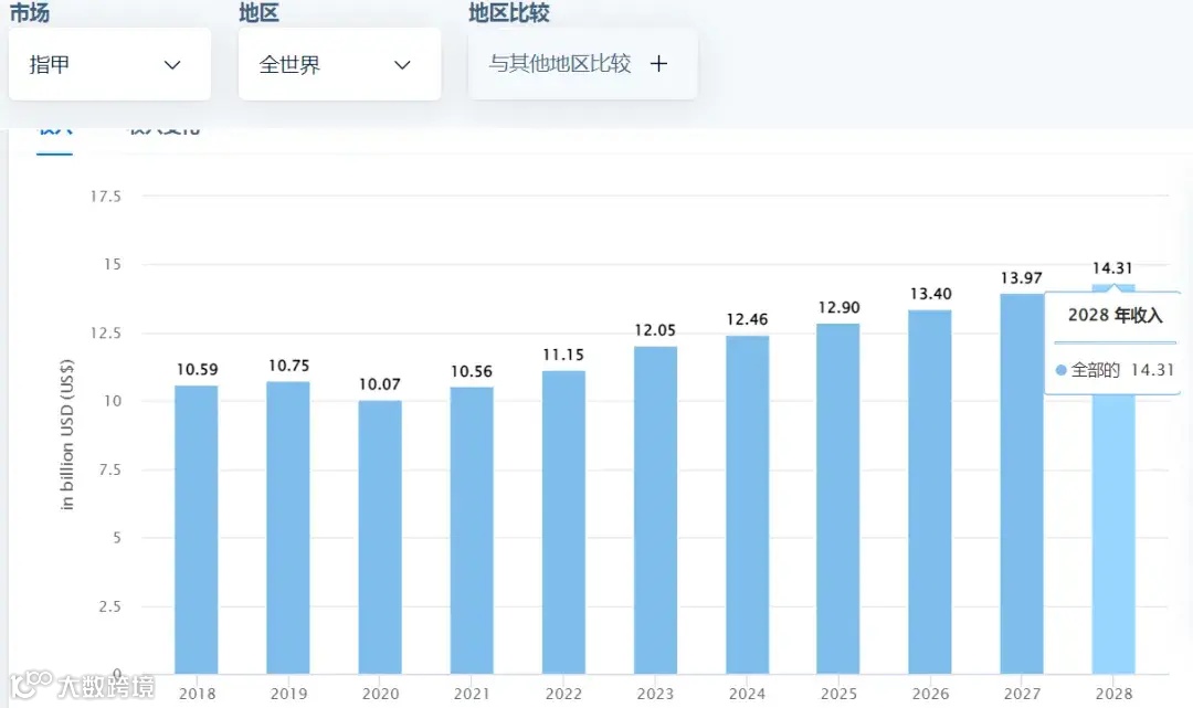 全球美甲市场规模增长趋势 图源:Statista