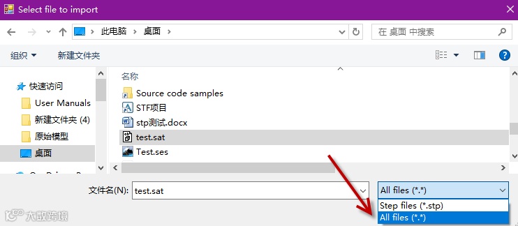 这里默认是只过滤stp格式,如果是sat格式,选择All file才可以选得到(可能很多人只知道stp,确不知道sat也可以导入,是这个原因)