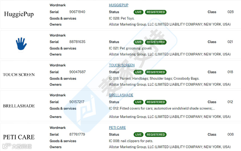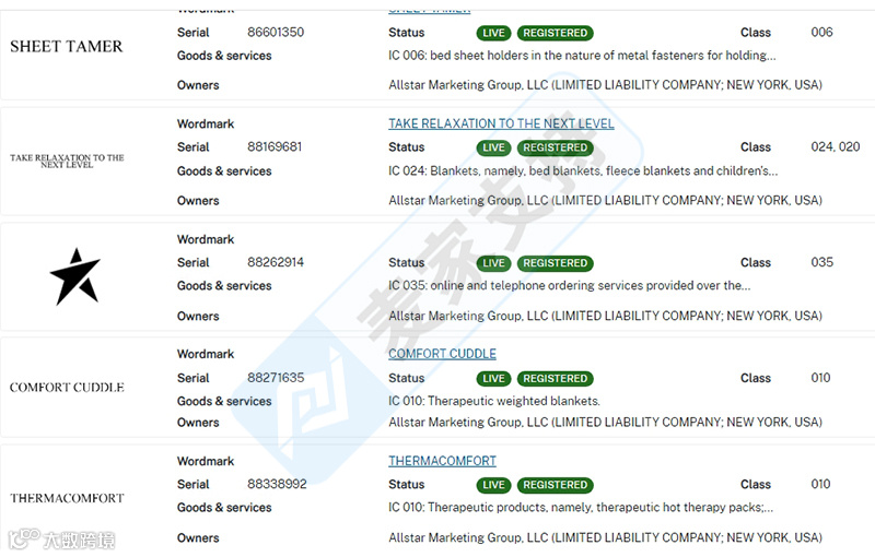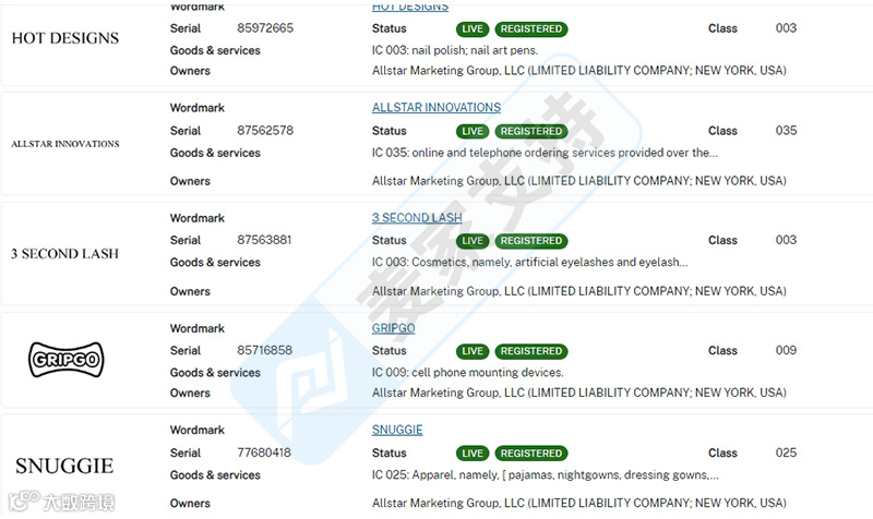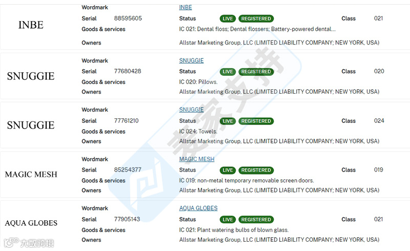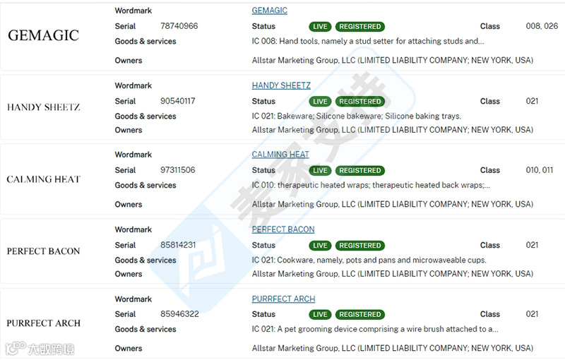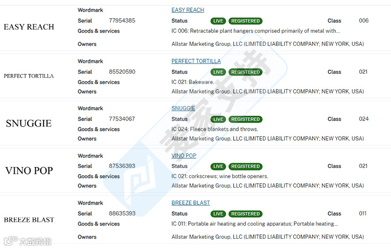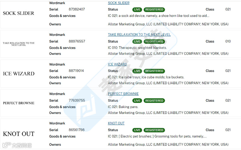 Allstar Marketing Group LLC拥有多个消费品牌,如带袖子的Snuggie毛毯、Topsy Turvy花盆、Perfect Brownie平底锅套装、Aqua Globes浇水灯泡、Bumpits发胶和Bendaroos建筑棒等。为保护其知识产权不受侵害,该公司注册了50个商标、版权和专利,如TRUE TOUCH撸毛神器手套、ICE GENIE CUBE冰桶以及Clever Tongs 2合1硅胶多功能食物夹等,并在近两年多次委托Sullivan 律所发起维权。