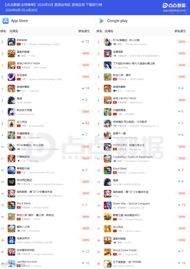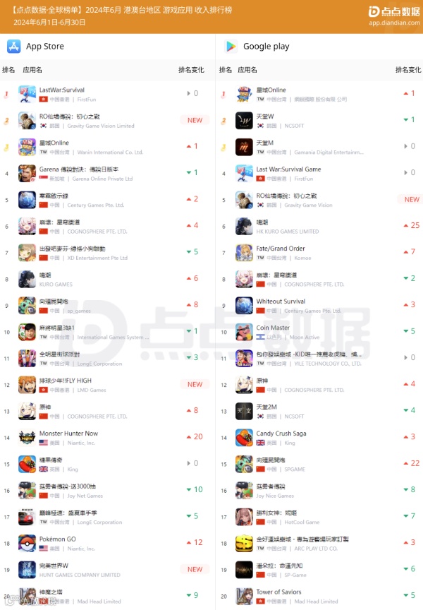 6月港澳台地区榜丨《RO仙境傳說:初心之戰》上线首月下载收入双端表现亮眼;《LastWar:Survival》收入再破亿