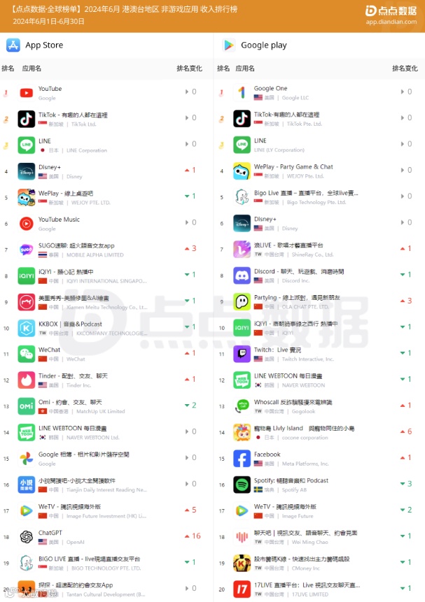 统计周期内,六月港澳台地区应用收入榜双平台应用收入榜冠军依旧由音视频社交应用《YouTube》和谷歌官方应用《Google One》蝉联。该地区非游应用收入冠军也再次由前者凭借超过370万美元的预估收入蝉联,后者预估收入约为126万美元,收入数据都有小幅下滑。