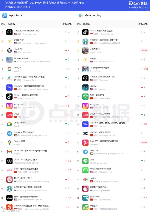 依托互联网移动应用大数据平台“点点数据”(https://app.diandian.com/),点点出海基于港澳台地区App Store和Google Play两大应用市场,分别整理下载榜和收入榜Top20应用&游戏,希望帮助从业者更好地了解海外最新的产品趋势和变化。