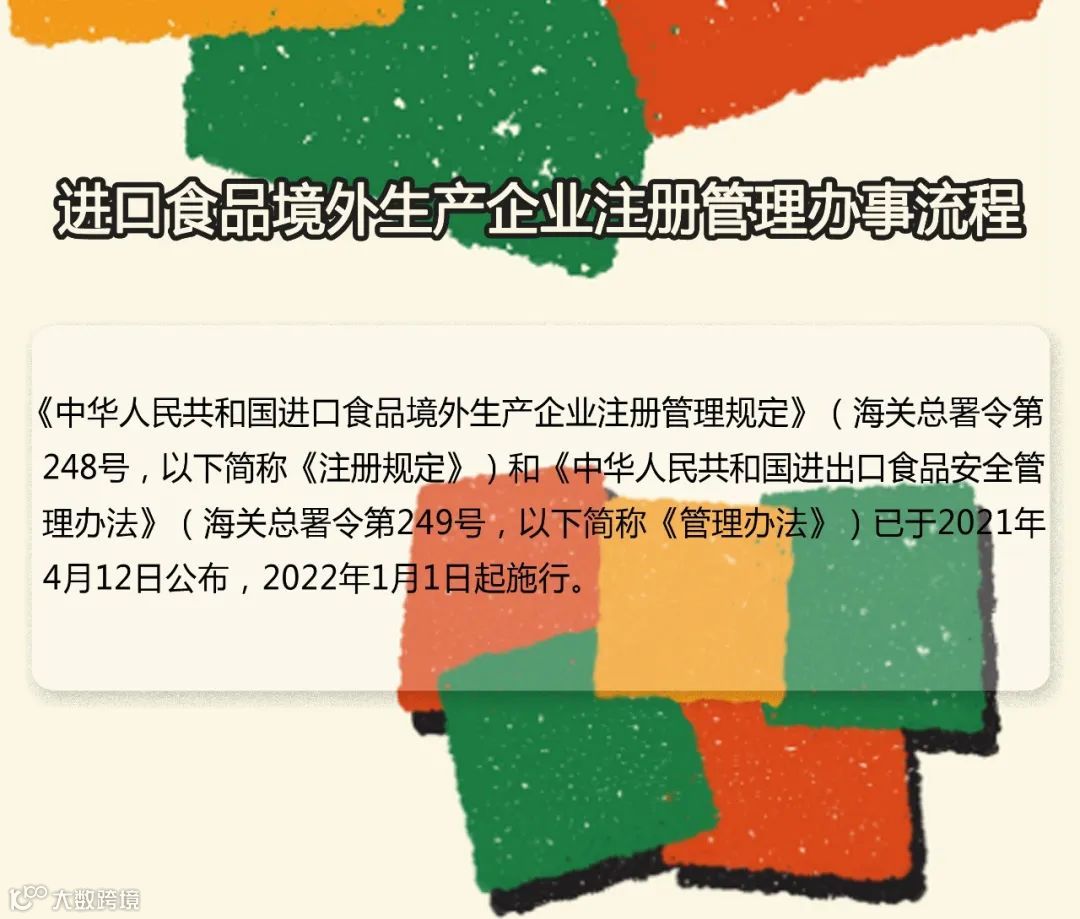 向中国境内出口食品的境外生产、加工、贮存企业(以下统称进口食品境外生产企业)需完成注册。