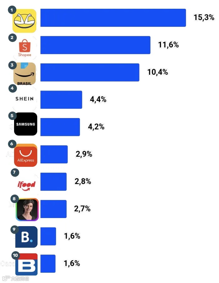 在平台竞争层面,市场集中度呈现稳步提升态势,巴西十大电商企业已占据总用户量的57.5%,形成了相对清晰的头部梯队。