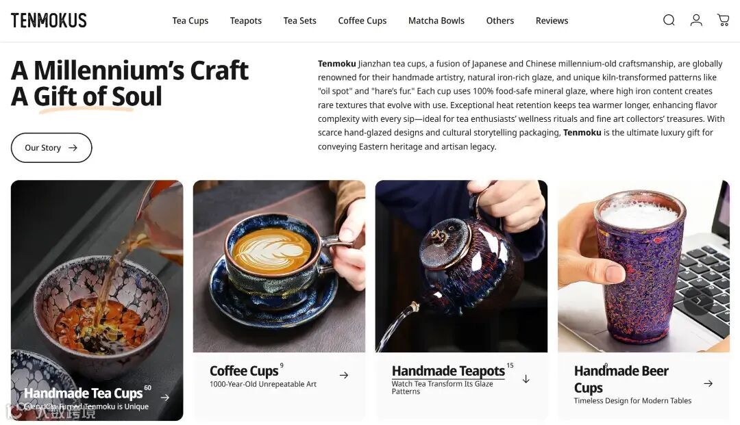 并非所有非遗都适合高端路线,Temmokus与产业集群模式提供了另一种可能。Temmokus将建盏技艺绑定全球“茶生活”场景,聚焦茶具实用美学,通过跨境平台布局全球,年营收达200万美元。