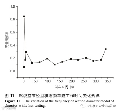 发动机动力学特性与工作状态相关, 且随工作时间变化较大, 如图11所示的燃烧室节径型模态频率具有随试车时间变化的特性;