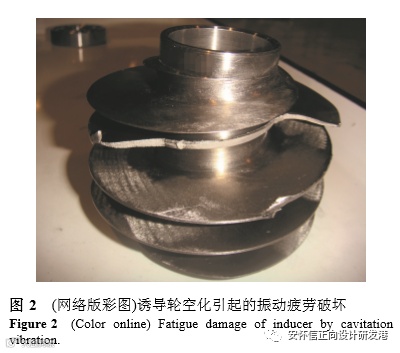 大推力液体火箭发动机涡轮泵的内部流动十分复杂, 空化、动静干涉和间隙密封等几类特殊的不稳定流动形式, 极易诱发不稳定现象并通过流固相互作用生成大的振动响应. 空化指的是静止或流动的液体中, 在局部低压区域发生气化的现象, 是一种与液体压力有关的两相动态过程, 能在极短的时间内发生. 当出现部分液相变为汽相时, 将导致涡轮泵载荷的急剧下降; 而汽相在高压处又转变为液相, 气泡溃灭过程将产生巨大的压力脉动作用于诱导轮的叶片表面, 引起诱导轮的剥蚀或结构破坏(图2)。