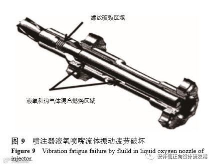 喷注器是发动机燃烧室头部的主要组件, 将推进剂以适当比例和状态喷入燃烧室, 完成推进剂的喷射、雾化、蒸发、混合以及燃烧. 喷注器由顶盖和数百个喷嘴组成, 和燃烧室一起构成封闭的承受高温高压的结构, 头部内高温高速气液环境诱导的振动问题与弹性管束换热器相似, 漩涡脱落、紊流抖振、流体弹性激振都会引起喷嘴的失效. 在SSME发动机研制的早期, 曾反复多次出现液氧喷嘴振动疲劳破坏故障(图9), 引发喷注器局部过热而烧毁喷注器甚至燃烧室的严重故障。