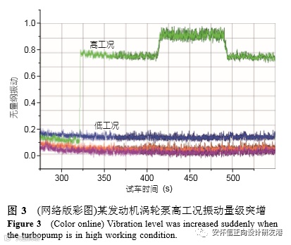 低频压力脉动改变泵汽蚀柔度、动态增益等液路动态特性关键参数, 诱发大型液体火箭的弹体纵向耦合振动(POGO). 涡轮泵空化所引起的复杂流体动力、空化条件下的涡轮泵转子动力学等问题是当今液体火箭推进领域的研究热点和前沿课题. 动静干涉是指在离心泵内转子运转过程中, 转子和定子间相对位置变化产生的非定常流动现象, 主要包括尾迹效应和势流效应. 动静叶栅相互作用引起的压力脉动是离心泵结构振动产生的主要根源. 振动频谱特征表现为叶片通过频率及其倍频, 且在发动机的每个部位都能检测到这种压力脉动的影响. 在SSME发动机、日本LE-7发动机氧泵研制过程中, 均发生过流体激振引起的同步或超同步振动量级过大问题. 国内某发动机推力提升研制过程中, 增加转速时出现了振动量级突增的现象(图3).