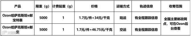 Ozon Global为简化两国间的物流链与中国邮政签订了合作协议,双方同意显著降低中国卖家的物流费用,使商品运往哈萨克斯坦更加具成本效益。例如,500克包裹的航空运输费用为25元人民币,陆运费用为18.7元人民币,平均比标准费用低15%。