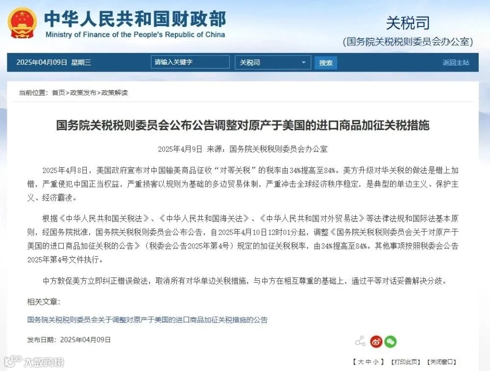 据人民日报消息,经国务院批准,国务院关税税则委员会公布公告,自2025年4月10日12时01分起,调整《国务院关税税则委员会关于对原产于美国的进口商品加征关税的公告》(税委会公告2025年第4号)规定的加征关税税率,由34%提高至84%。