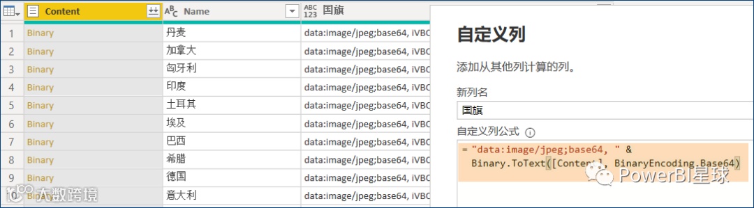 新建自定义列,使用M语言将[Content]字段转换为Base64编码格式: