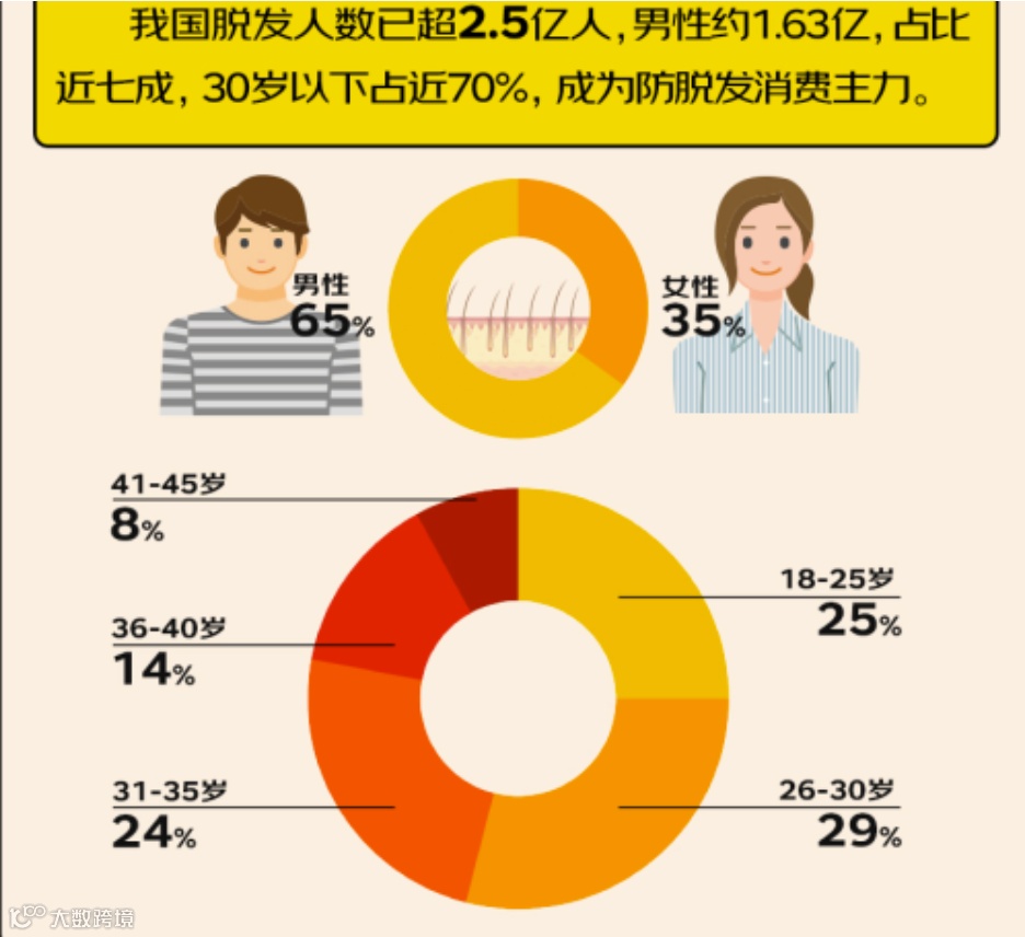 2023年我国脱发人群已突破2.5亿人,其中年轻人占比近七成,成为防脱发消费的主力军。《2023脱发人群及防脱消费报告》中提到,有脱发隐忧的人群中女性占比超三成,整体人数约为8700万。随着社会竞争日益激烈,人们的精神压力加大,环境恶化和染发烫发的流行,脱发现象呈现出明显的上升趋势且趋于年轻化。全球脱发市场规模2021年至少达88.1亿美元,预计2026年将增长至134.4亿美元(约合896亿人民币),年均复合增长率达到8.8%。