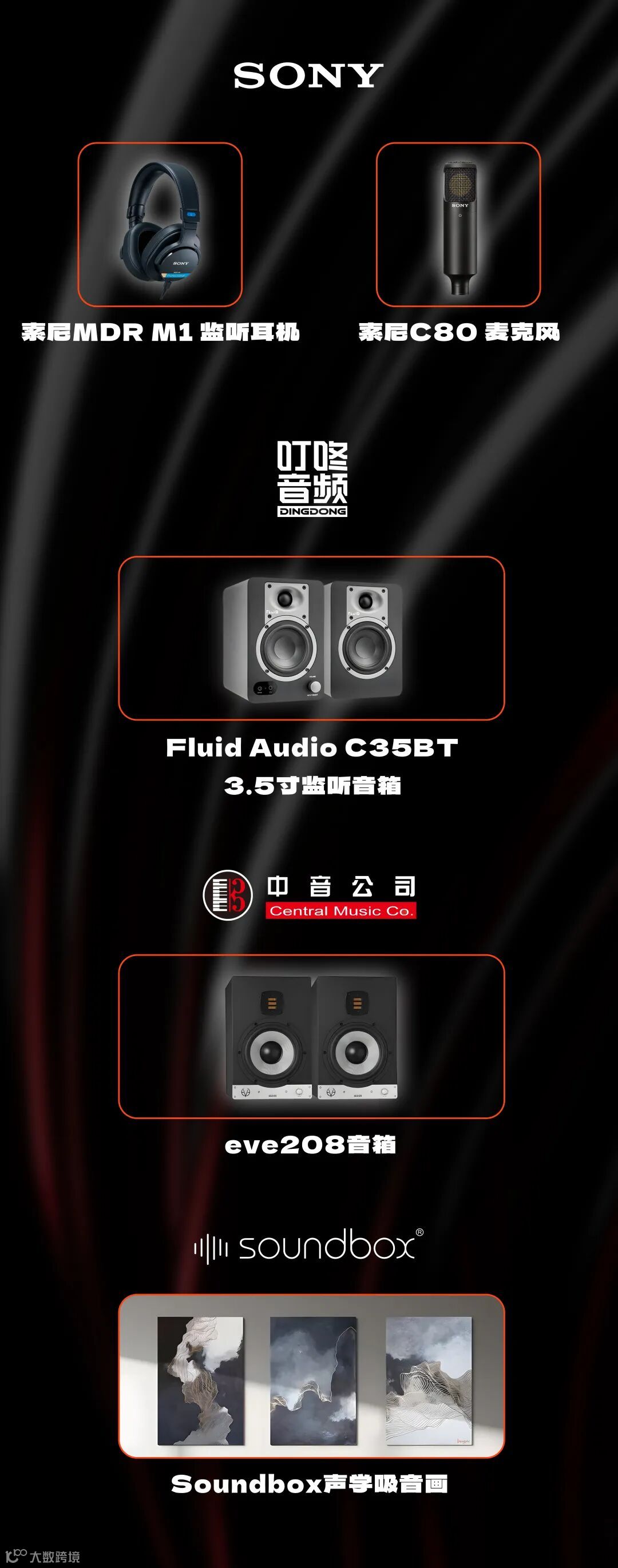 赛事奖品阵容同步升级,覆盖从录制到监听的专业链路:索尼提供MDR-M1监听耳机与C80麦克风、叮咚音频支持Fluid Audio C35BT 3.5寸监听音箱、中音公司为赛事提供eve208监听音箱、声博士提供声学吸音画。