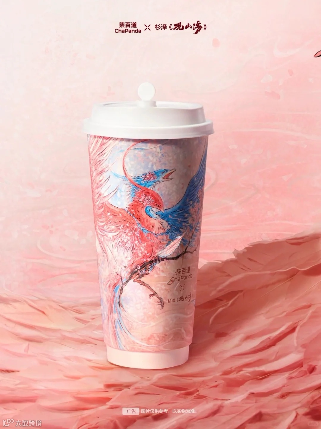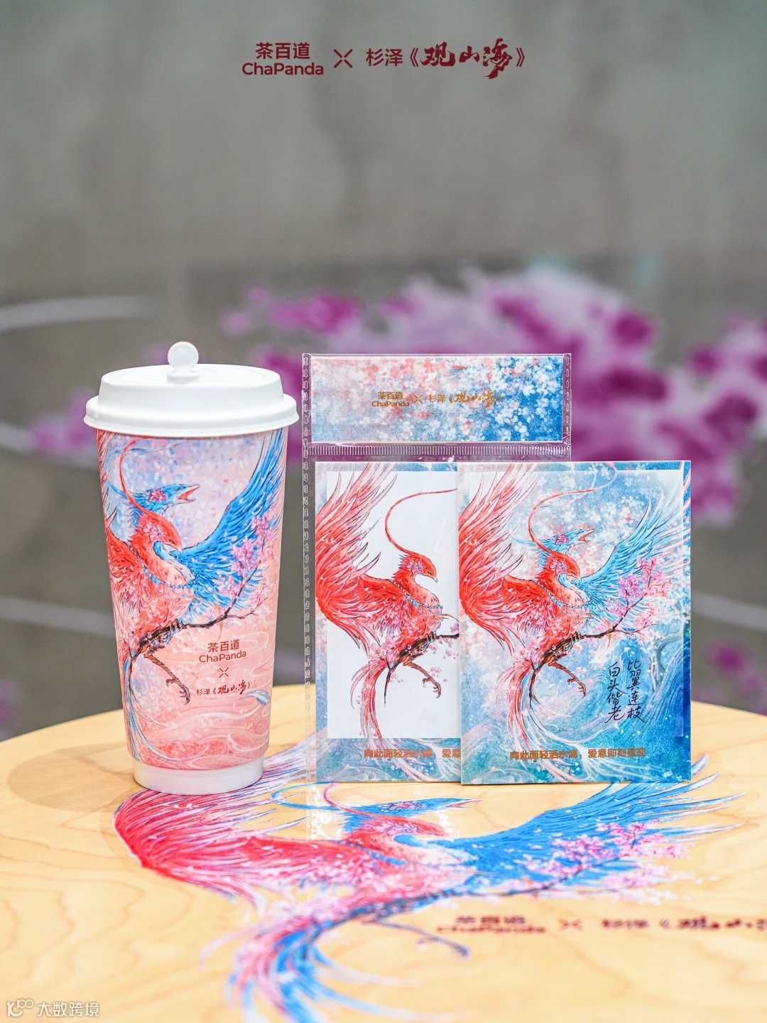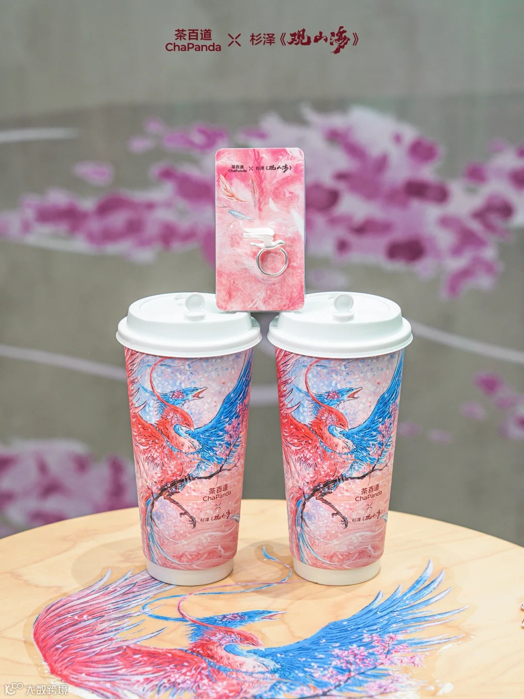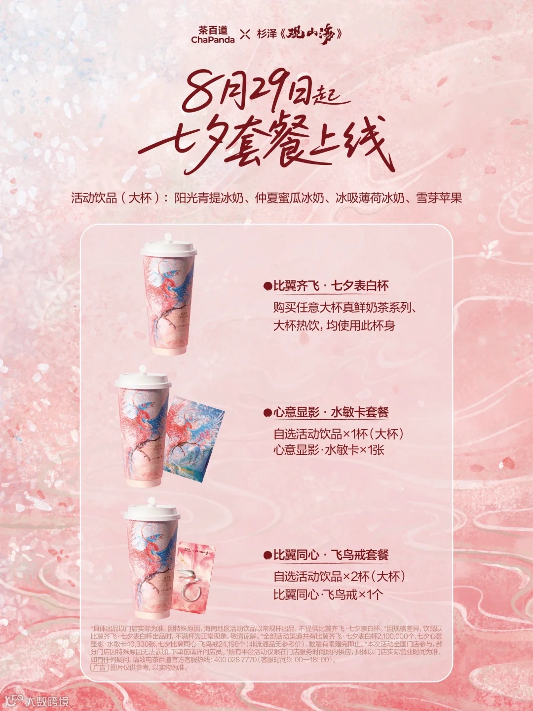 8月29日起,茶百道携手画家杉泽推出《观山海》七夕限定联动。购买任意大杯真鲜奶茶或热饮即可获得联名杯身,选购「水敏卡套餐」赠送主题水敏卡,「飞鸟戒套餐」则附赠限定飞鸟戒。全国主题门店同步上线,以山海为媒,传递中式浪漫。