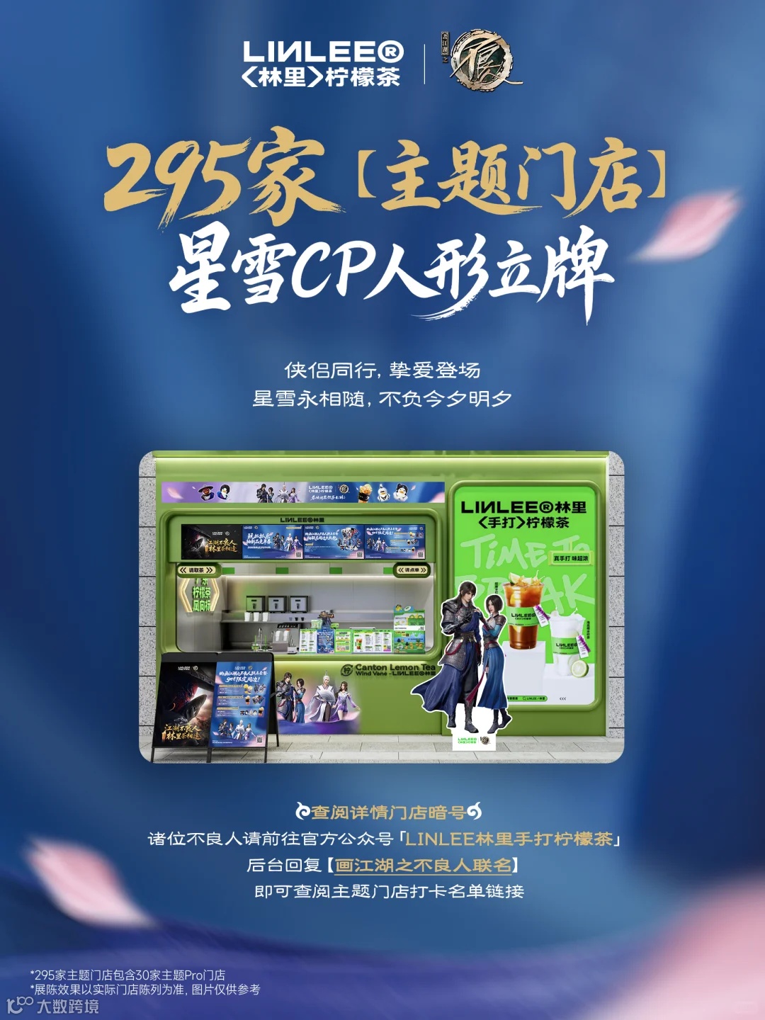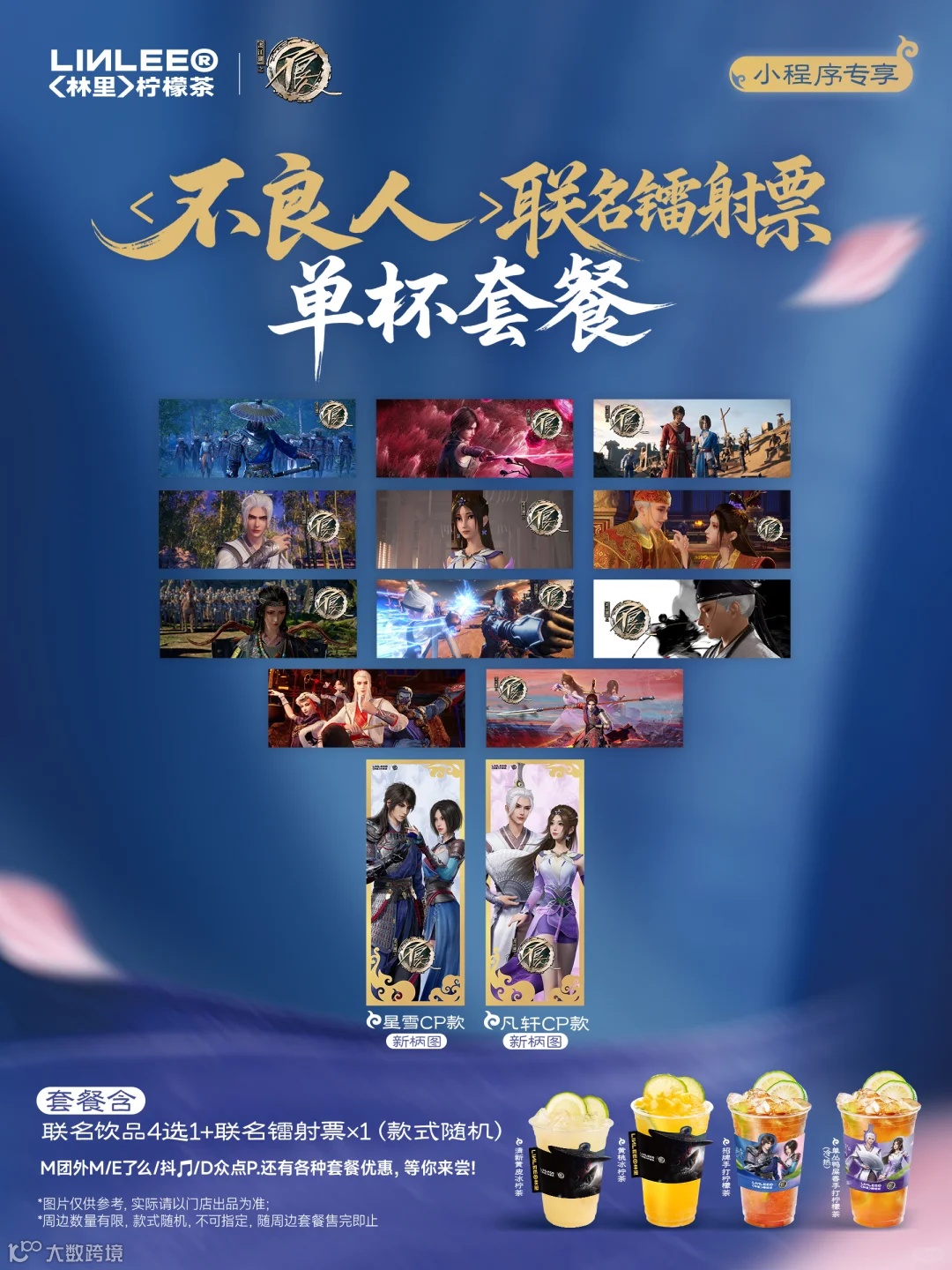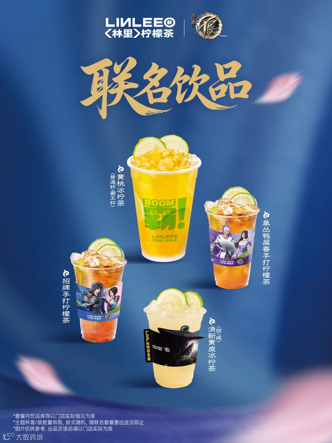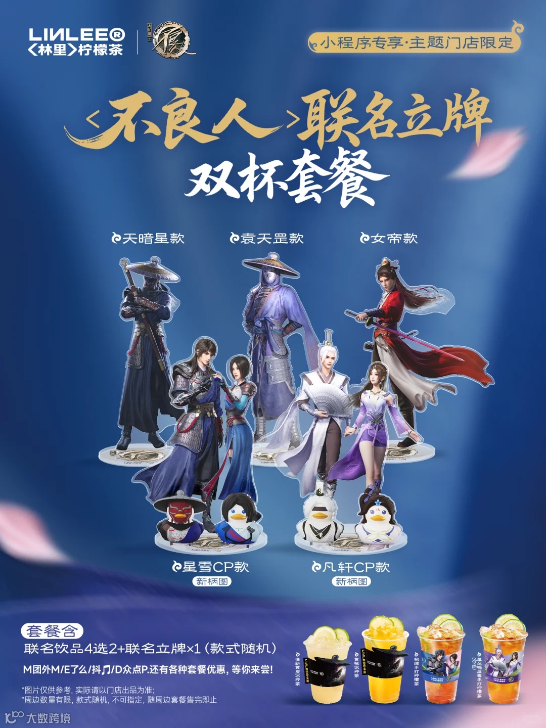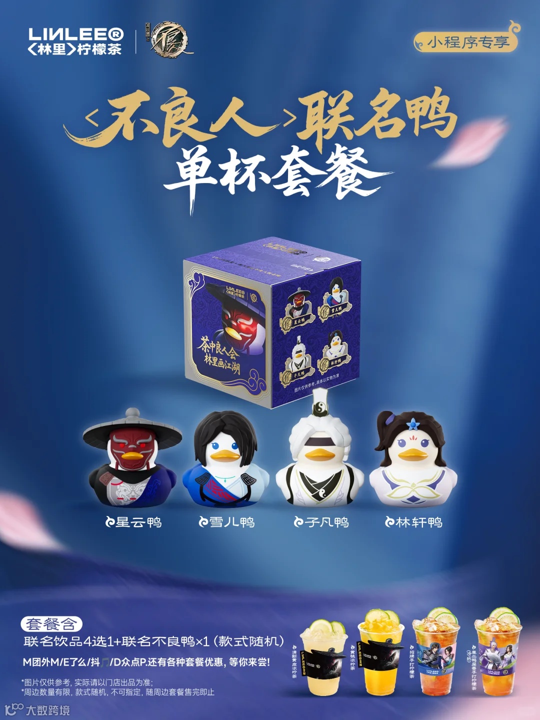 8月28日起,林里全国门店上线联名套餐,下单即随机获赠呆萌鸭仔或镭射票。主题店推出5款人形立牌套餐,杯套、纸袋全面换新,打造国风茶饮新体验。