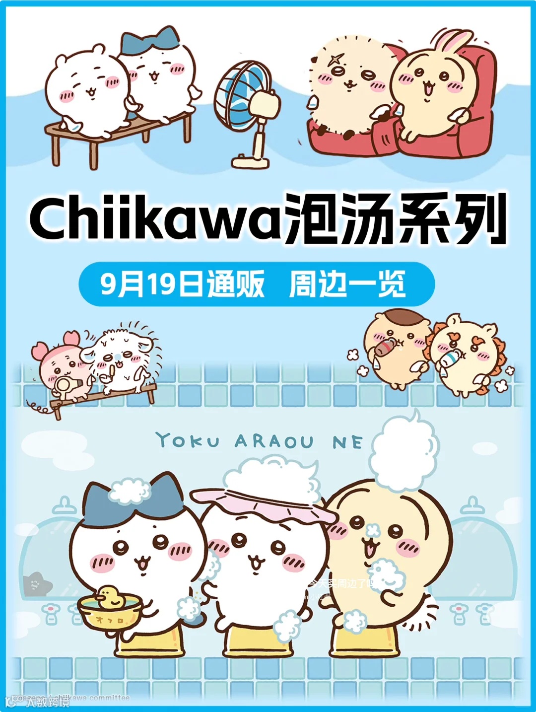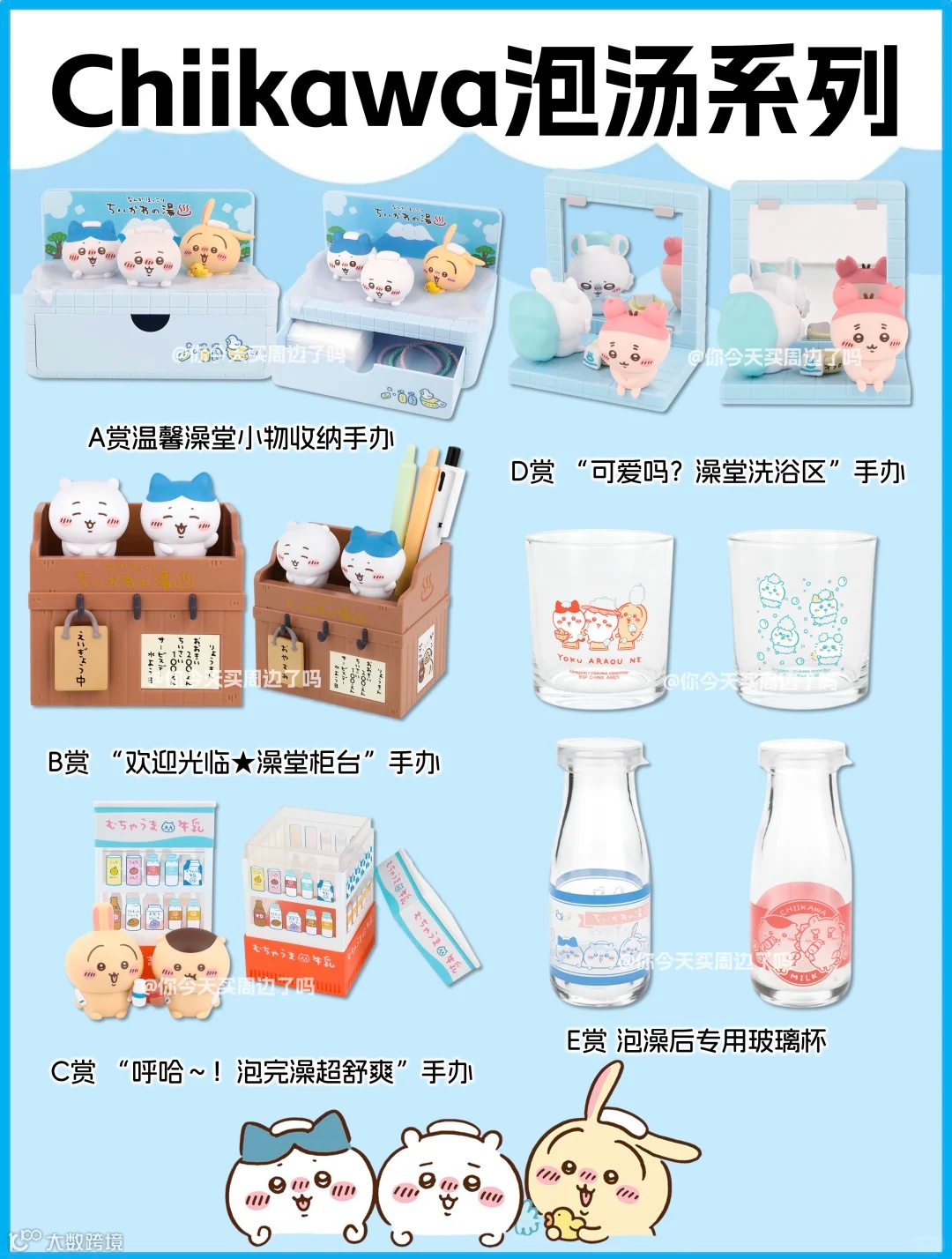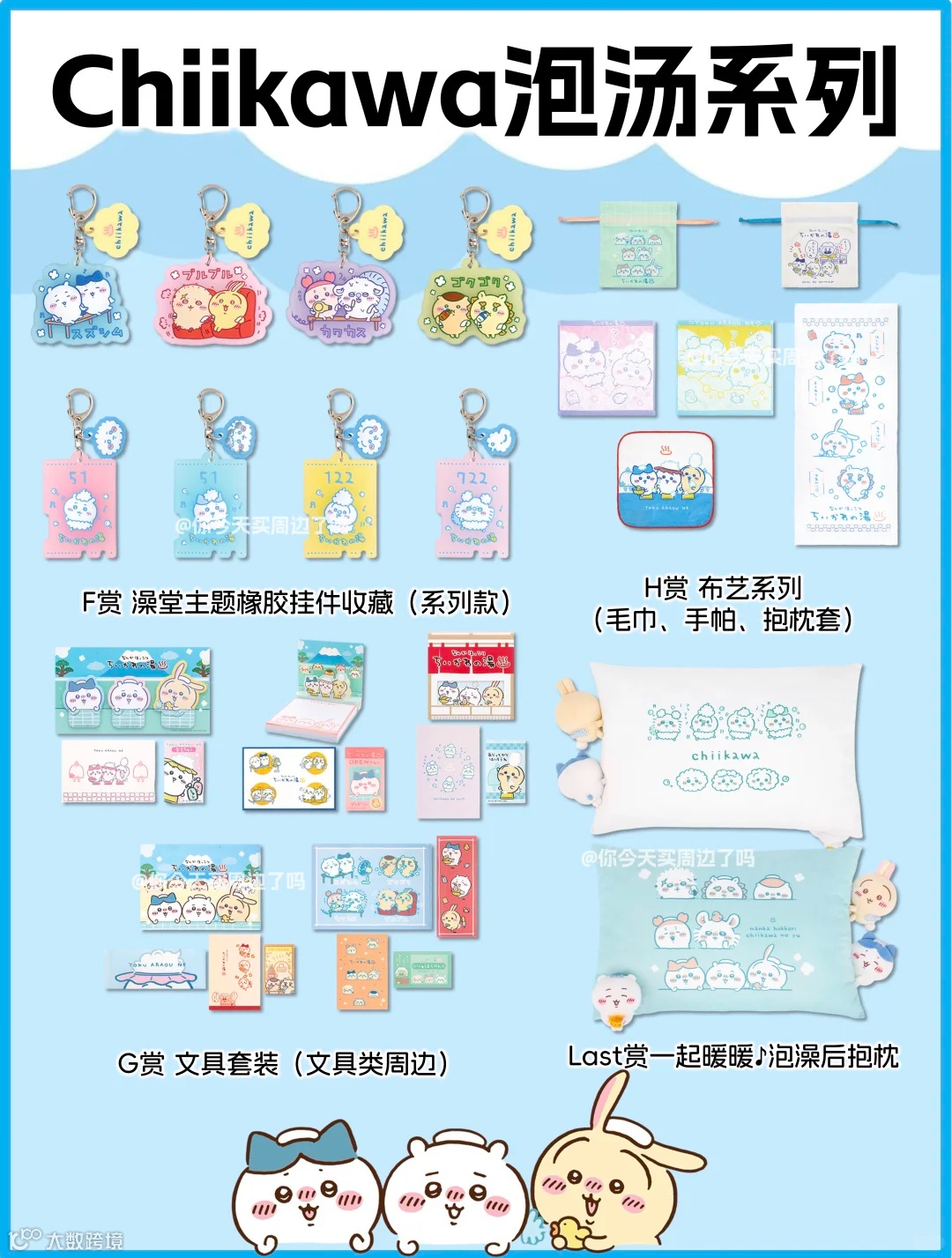 Chiikawa泡汤系列抽赏活动开启,奖品包括A赏「澡堂小物收纳手办」、B赏「澡堂柜台手办」、C赏「泡澡舒爽手办」,以及F赏橡胶挂件、H赏毛巾手帕套装、G赏文具周边,Last赏为「泡澡后抱枕」。集赏机制提升收藏乐趣,吸引粉丝积极参与。