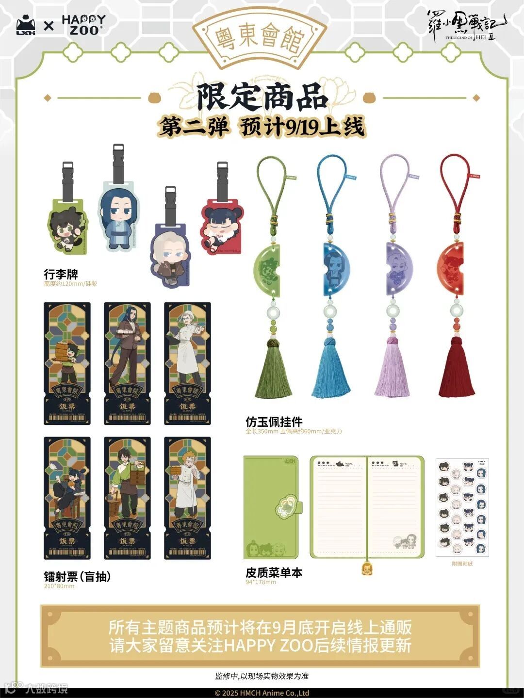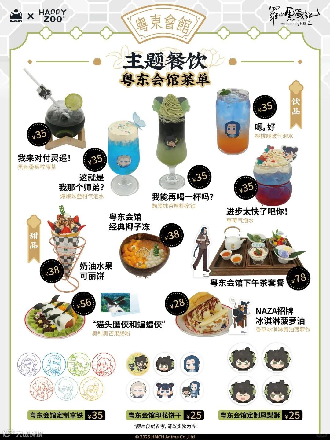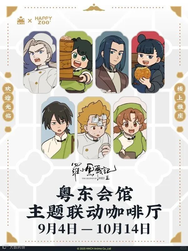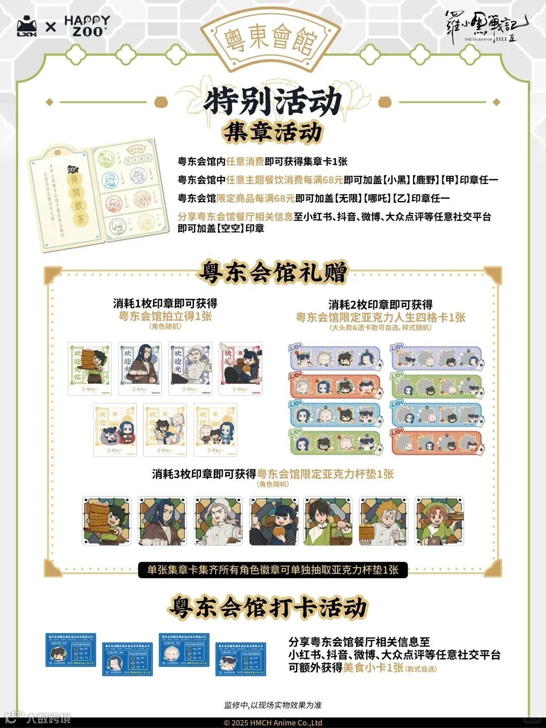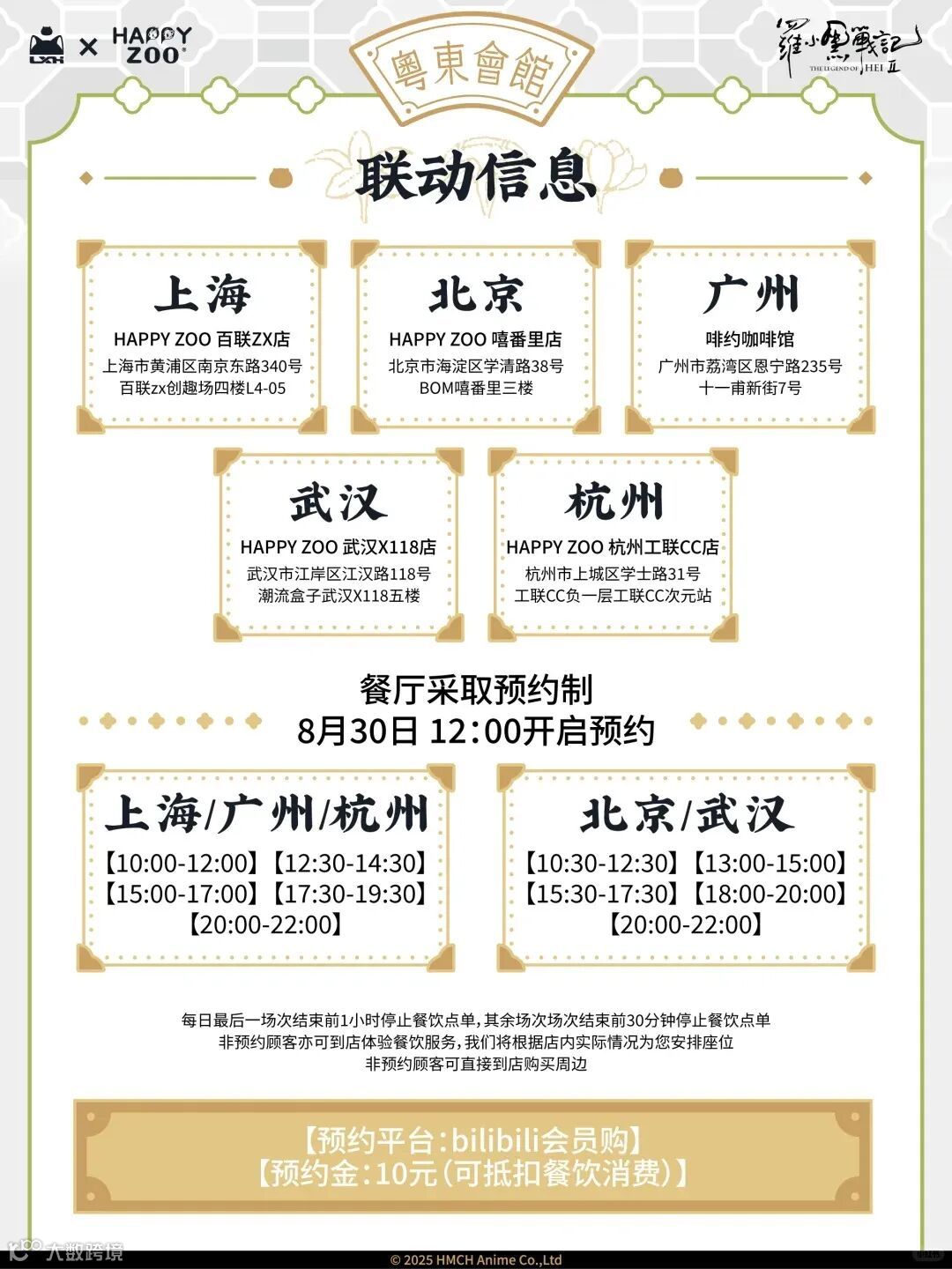 粤东会馆主题餐厅将于9月4日登陆上海、北京、广州、杭州、武汉五城,首波限定周边同步发售。店内消费满68元可盖角色印章,分享社交平台再得一枚,集章可兑换拍立得小卡、亚克力四格卡或杯垫。预约通道于8月30日12:00开放,9月底开启线上销售。