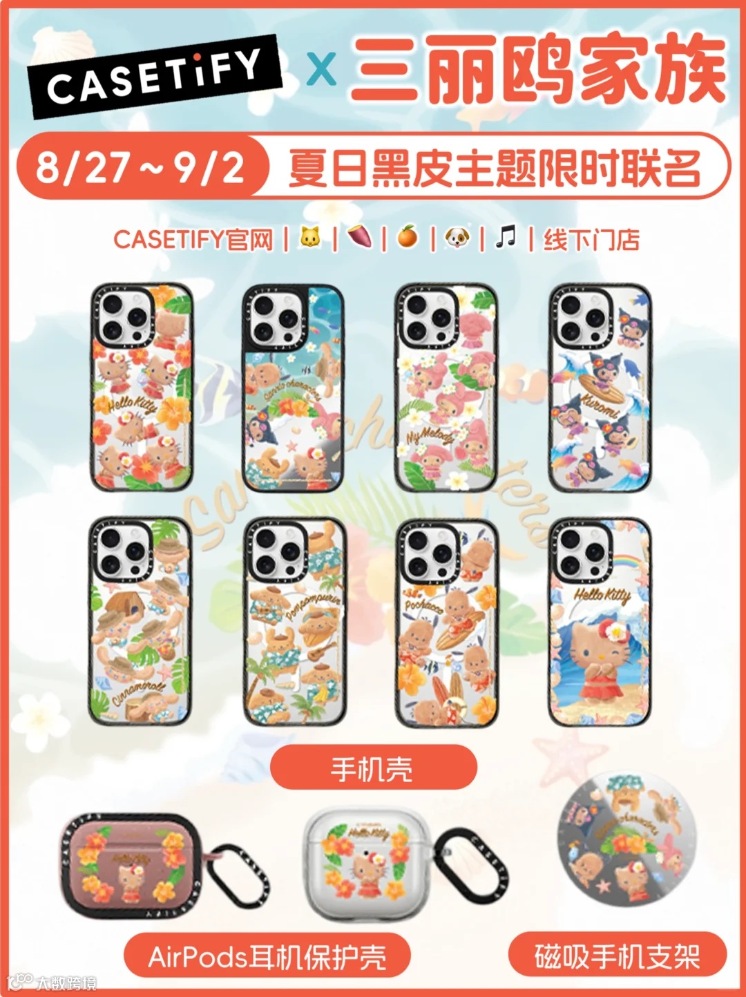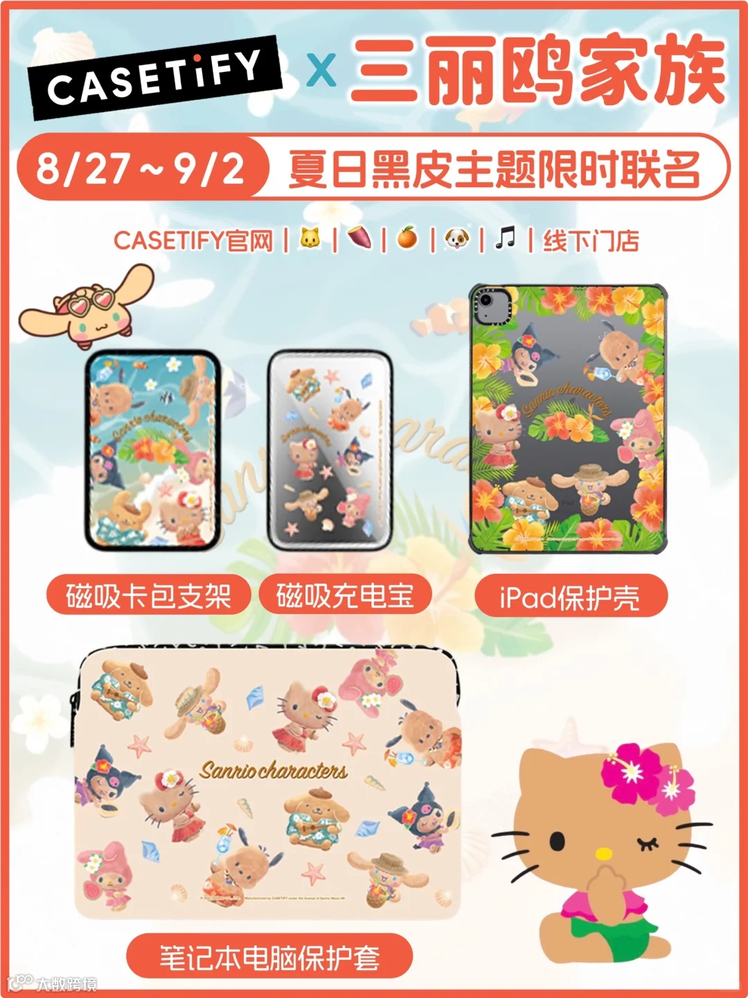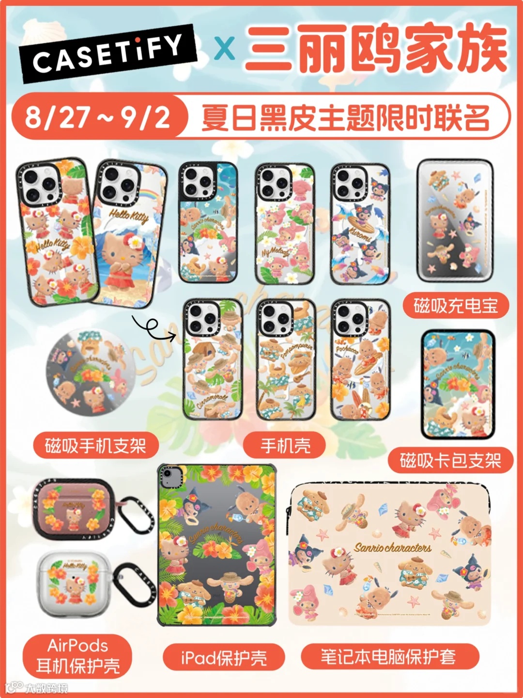 8月27日至9月2日,CASETiFY携手三丽鸥黑皮家族推出夏日限定系列,涵盖磁吸充电宝、手机壳、iPad保护壳等配件。凯蒂猫、美乐蒂、酷洛米等角色以“黑皮”造型亮相,兼具实用性与潮流感。