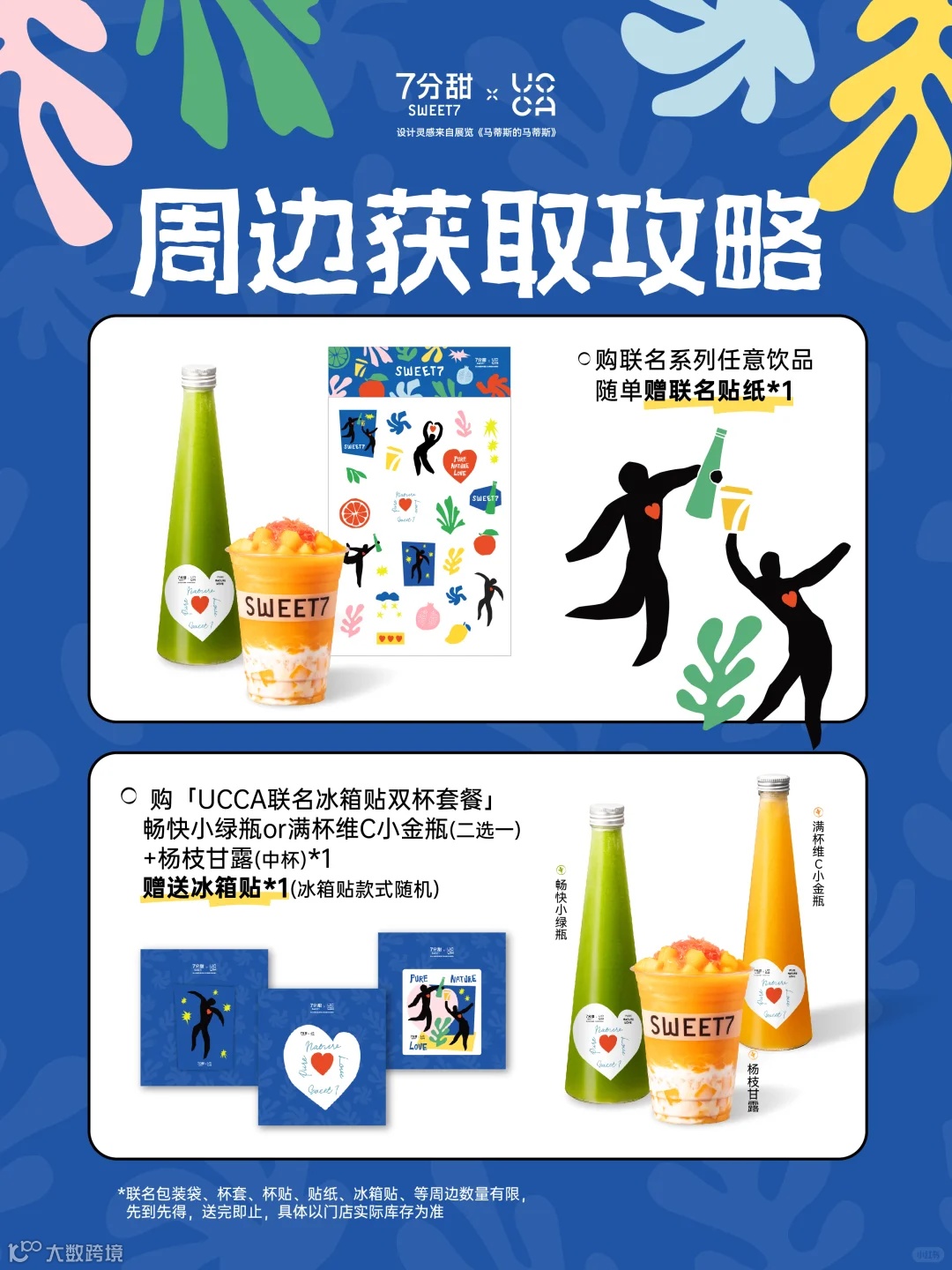 8月29日起,7分甜联合UCCA尤伦斯当代艺术中心推出艺术联名活动。购买任意饮品赠送联名贴纸,双杯套餐(杨枝甘露+小绿瓶/小金瓶)可获随机冰箱贴。全国20余城主题门店推出限定套餐,加赠帆布袋或线香,让饮品与艺术完美融合。