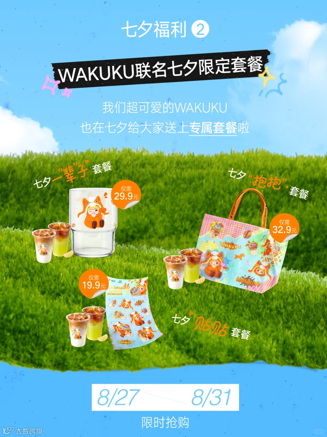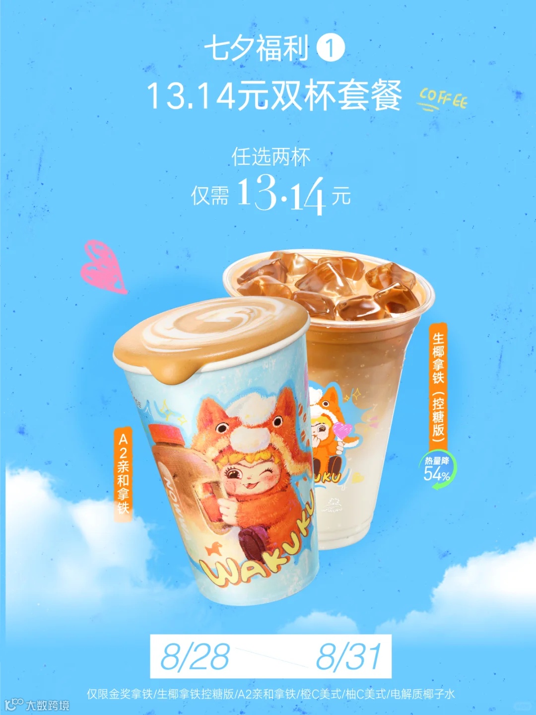 8月28日至31日,NOWWA挪瓦咖啡联合WAKUKU推出七夕限定优惠:6款指定饮品双杯仅需13.14元,寓意“一生一世”。同步上线联名套餐,包含专属周边,吸引情侣及年轻群体参与。