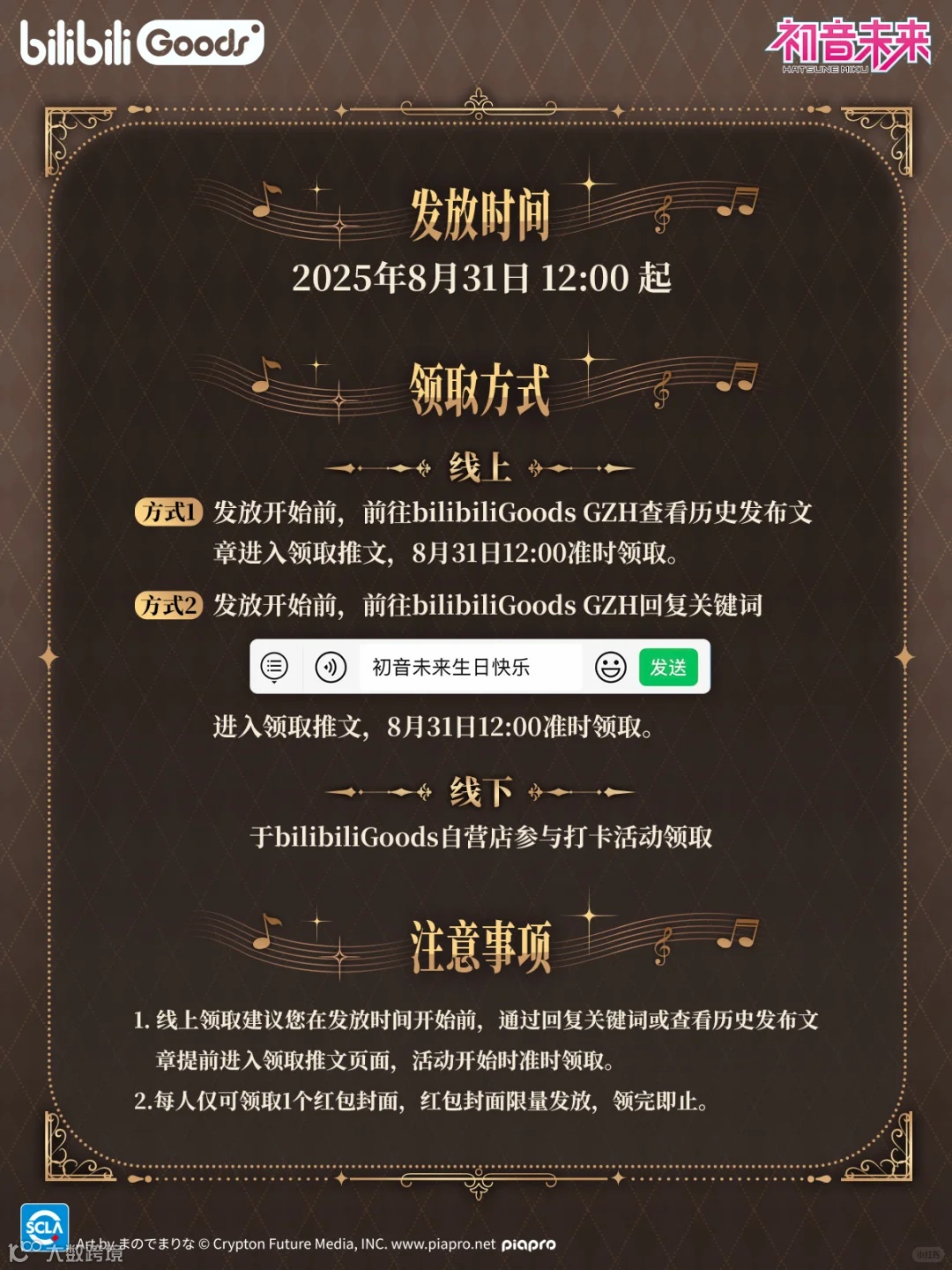 为庆祝初音未来生日,bilibiliGoods推出「命定萦绕系列」限定红包封面,8月31日正式上线。用户可通过官方公众号获取领取入口。北京、上海、杭州、成都等9城自营店同步开展线下庆生活动,粉丝可前往参与解锁专属福利。