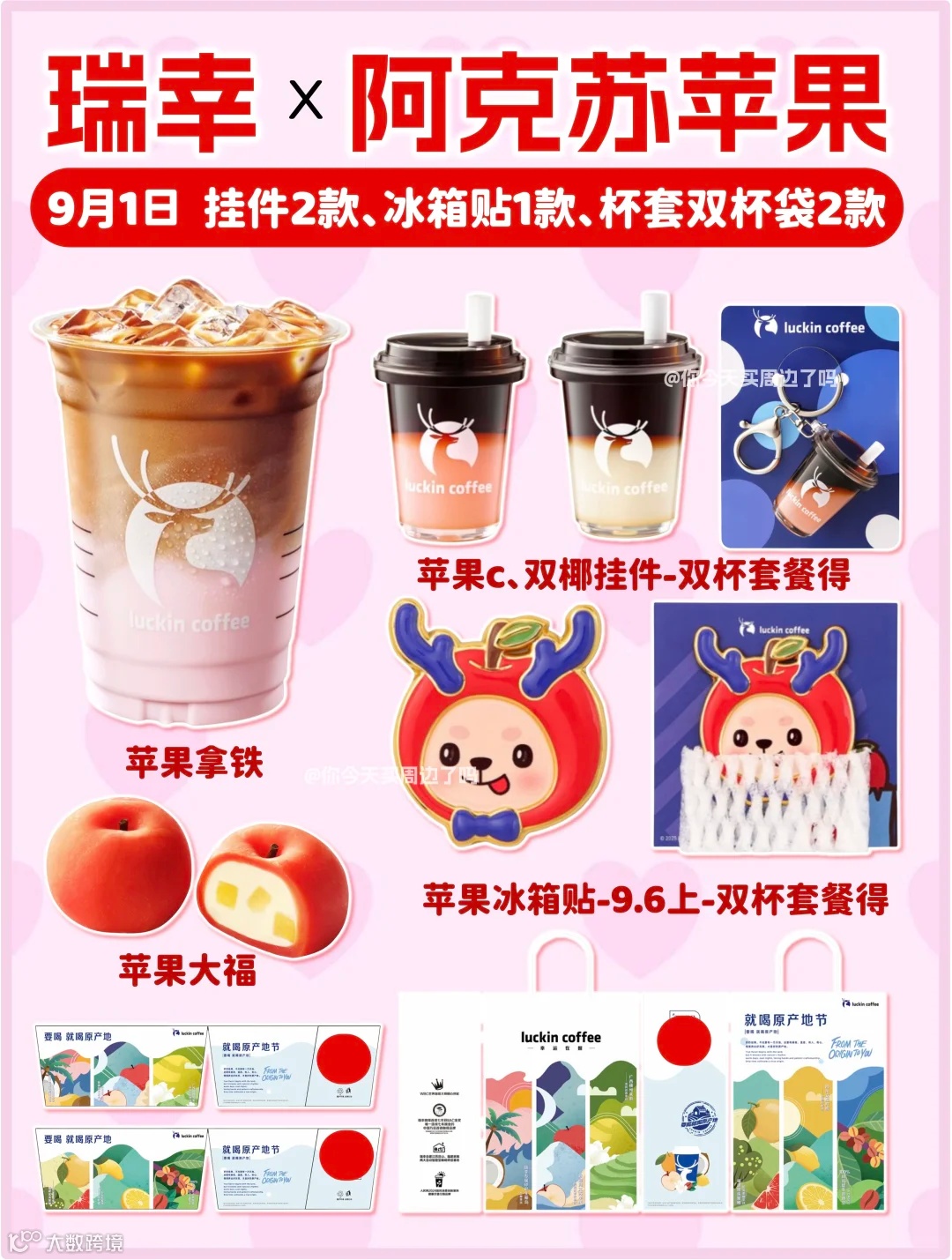 瑞幸咖啡推出秋季限定套餐,融合阿克苏苹果元素,周边包含双椰挂件、主题杯套、双杯袋。9月6日将上线阿克苏苹果冰箱贴,打造味觉与视觉双重体验。